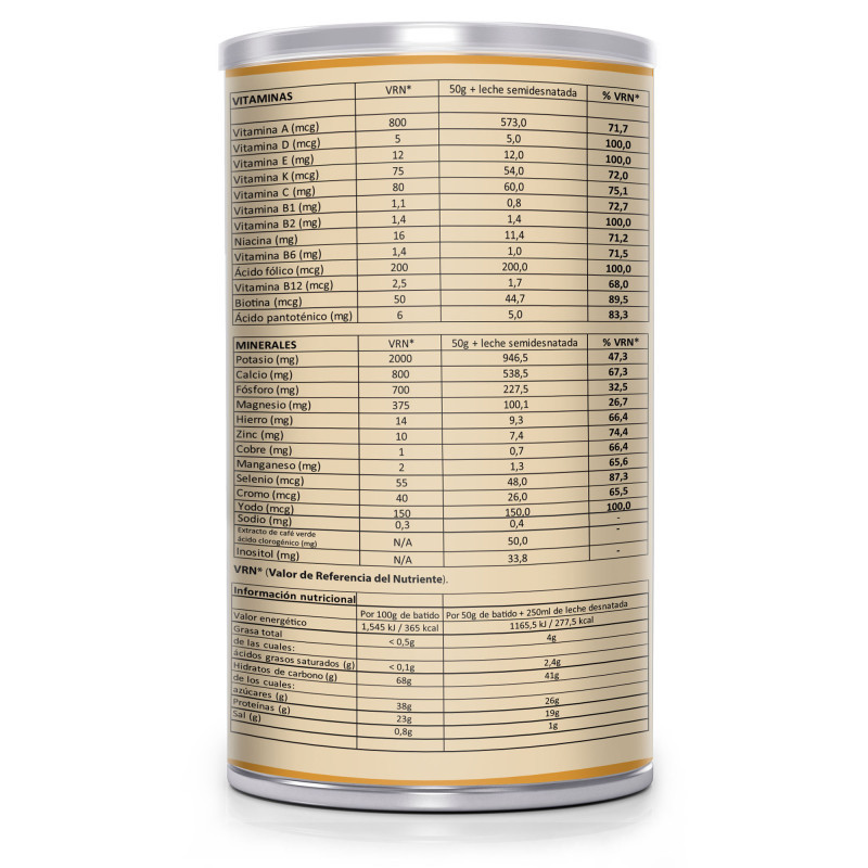 Los batidos saciantes están diseñados para que funcionen como sustitutos de una comida en dietas de control de peso, también como aporte adicional de nutrientes en estados carenciales y para personas con elevadas necesidades nutricionales como los deportistas, personas mayores y convalecientes. El café verde contiene ácidos clorogénicos que en dietas de adelgazamiento aumentan la lipólisis y sensación de saciedad; también estimulan la utilización de las reservas de grasa para obtener energía. El café verde tiene propiedades antioxidantes, antiinflamatorias y reduce la insulina en la sangre con lo que se convierte en un gran protector cardiovascular. Las vitaminas y los minerales que se encuentran en los batidos son esenciales para llevar a cabo nuestra vida diaria, y para que nuestro cuerpo pueda funcionar. Las vitaminas A, D, E y K que corresponden a las liposolubles (solubles en grasa) y las hidrosolubles (solubles en agua), como lo son las del grupo B, el ácido fólico y la vitamina C; tienen diversas e importantes funciones en nuestro cuerpo ya que participan en la formación de hormonas, células sanguíneas, sustancias químicas del sistema nervioso y material genético. Su gran importancia se debe también a que estas sustancias no pueden ser asimiladas por el organismo y tienen que ser obtenidas desde el exterior. Los minerales son nutrientes importantes para nuestro cuerpo, siendo esenciales para distintos procesos como las contracciones musculares, reacciones nerviosas y coagulación de la sangre, entre otros.