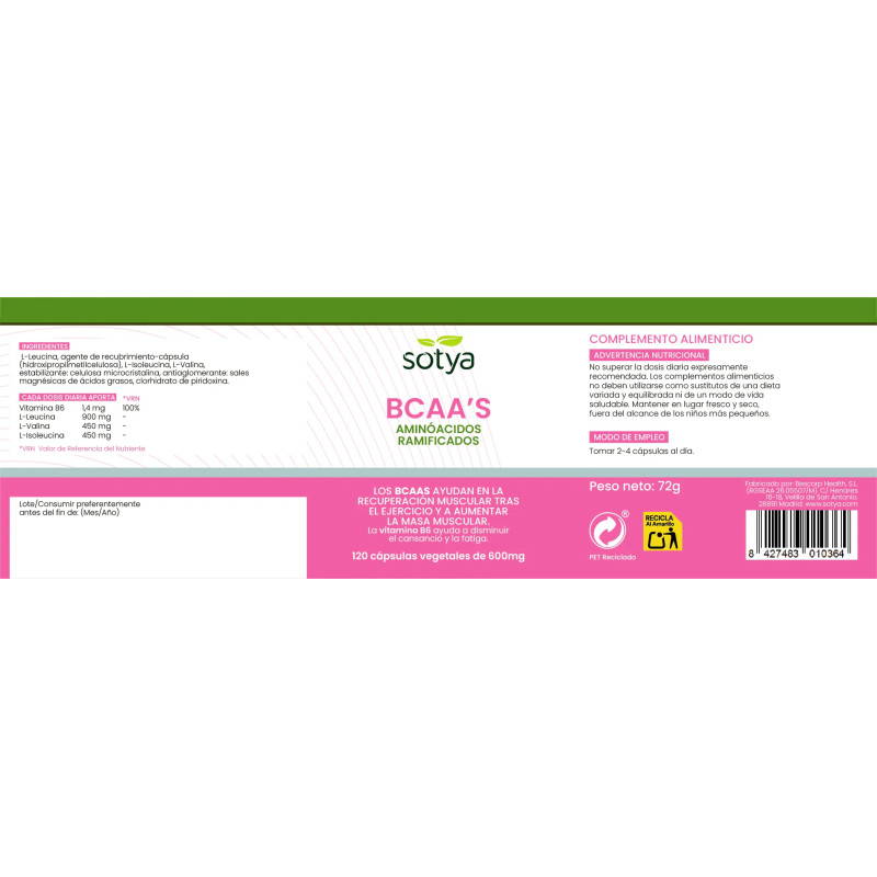 BCAA'S aminoacidos ramificados 600mg 120 capsulas Sotya