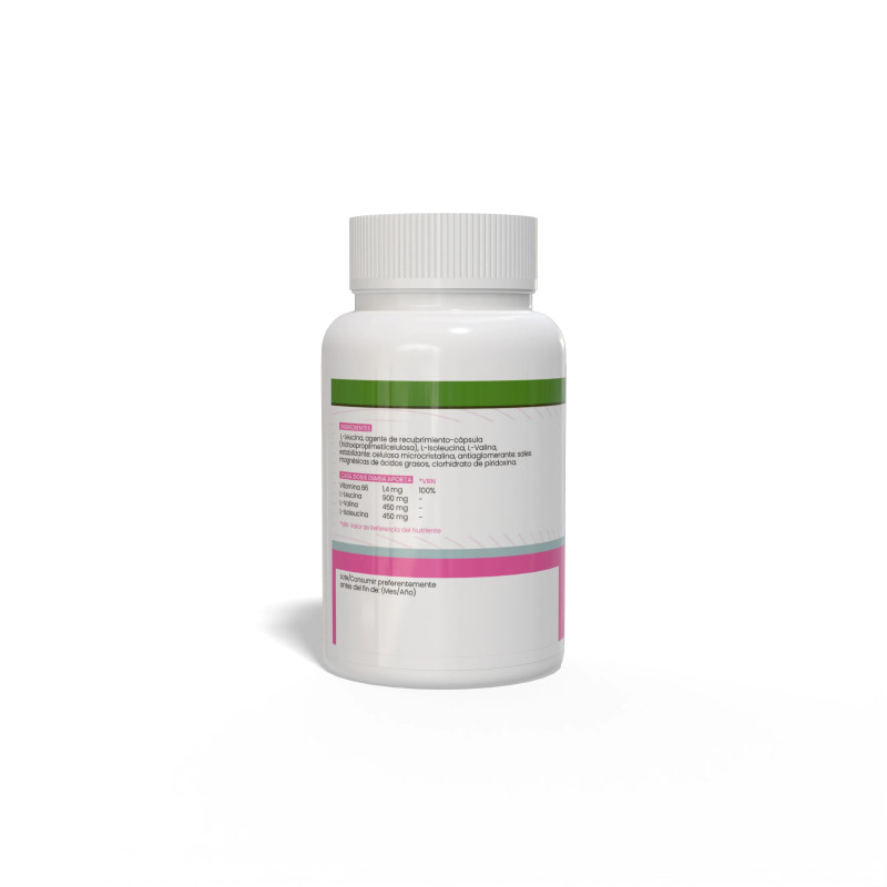 L-leucina, agente de recubrimiento (cápsula): celulosa, l-isoleucina, l-valina. estabilizante: celulosa microcristalina, anti aglomerante: estearato de magnesio y clorhidrato de piridoxina (vitamina b6)