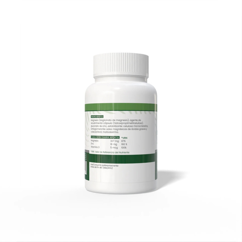 Magnesio (bisglicinato de magnesio), agente de recubrimiento: cápsula (hidroxipropilmetilcelulosa), gluconato de zinc, estabilizante: celulosa microcristalina, antiaglomerante: sales magnésicas de ácidos grasos, colecalciferol (vitamina D), maltodextrina.