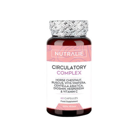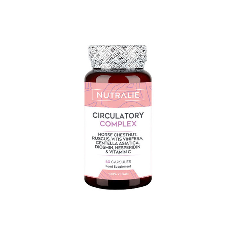 Circulatory Complex de Nutralie es un complemento alimenticio formulado con extractos de castaño de indias, rusco, vid roja, centella asiática, diosmina y hesperidina. Su combinación de ingredientes naturales está diseñada para favorecer la salud de los vasos sanguíneos, apoyar el metabolismo energético y contribuir a la protección frente al daño oxidativo gracias a su aporte de vitamina C.
