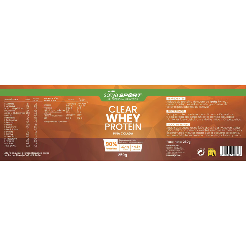 Clear Whey Protein de Sotya sabor Piña Colada es un suplemento proteico de alta pureza, bajo en azúcares y edulcorado con estevia. Su fórmula aporta un 90% de proteína y 22,4 g de BCAA por cada dosis, con menos de un 0,5% de lactosa, lo que lo convierte en una opción ideal para quienes buscan una bebida proteica ligera, refrescante y fácil de digerir.