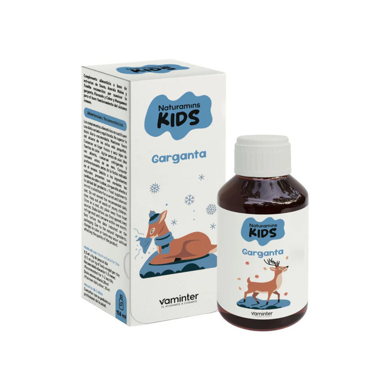Kids Jarabe Garganta de Naturamins es un complemento alimenticio elaborado con extractos vegetales y minerales que contribuyen al cuidado de la garganta y al buen funcionamiento del sistema inmune. Contiene sauco, acerola, malva y tomillo, reconocidos por sus propiedades calmantes y suavizantes, además del complejo Flavoxale® (própolis, miel de manuka y aceite esencial de manuka), cobre y manganeso, que favorecen las defensas naturales.