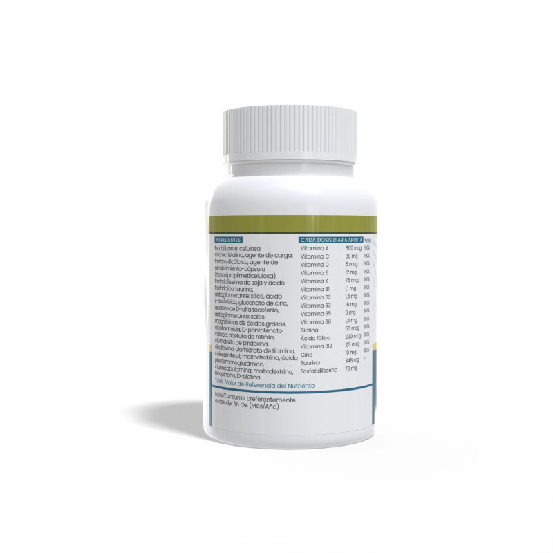 La taurina es un aminoácido que sirve como neurotransmisor (mensajero químico para el sistema nervioso), como regulador de la sal y del equilibrio del agua dentro de las células, y como estabilizador de las membranas celulares. La incorporación del complejo vitamínico se hace para evitar posibles carencias nutricionales en épocas donde las necesidades de nutrientes aumentan, por ejemplo, durante épocas de estrés tanto mental como físico. El Zinc desempeña un papel importante en la formación de memoria y estabilidad cognitiva. Regula las comunicaciones entre el hipocampo para mejorar las capacidades de memoria y aprendizaje. Una adecuada ingesta de zinc es un paso importante para una función cerebral óptima y puede impedir el deterioro cognitivo a medida que envejecemos.