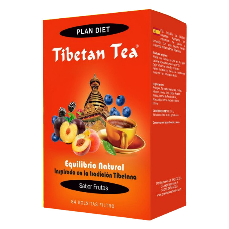 Tibetan Tea con Sabor a FrutasCombinación de hierbas naturales, según una antigua fórmula tibetana. Esta mezcla de hierbas enriquece y ayuda al organismo, estimulando al metabolismo, asistiendo al sistema nervioso, purificando el organismo, transformando las grasas en energía, liberando los líquidos y estimulando al sistema gastrointestinal. Tibetan Tea está compuesto al 100% por hierbas naturales, sin conservantes ni aditivos químicos.Modo de empleo: Vierta agua hirviendo en una taza y añada la bolsita de infusión, deje reposar 3-5 minutos. Se recomienda tomar 3 tazas diarias, aproximadamente 15 a 20 minutos después de cada comida.Ingredientes: Laurel, Tila, Escaramujo, Té Verde, Menta Poleo, Hierba Luisa.Presentación: Envase de 90 bolsitas de 2 gramos cada bolsita. Se preparan de 1 a 3 al día.